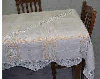 Hoje vou colocar uma toalha (dois posts seguidos com toalhas!!!), mas esta leva uns bicos em crochet que acho muito bonitos, apesar de sempre que uso esta toalha achar que os bicos estão mal empregues aqui, é que esta toalha é de um tecido que depois de lavar, não se amarrota nada (poderia nem ser necessário passar a ferro, (apesar de eu não gostar de ver uma toalha na mesa, sem estar passada), digam lá que sou doida, se não amarrota, não se passa não é?- Mas comigo não funciona assim, tudo tem de ser passado), mas aqui o caso é que só por causa destes bicos, tenho sempre de a passar.