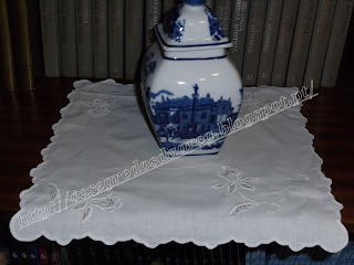 O acabamento dos quadrados de linho desta toalha, fazem a rosa completa , terminando então em bicos. Está muito bonita esta toalha !!